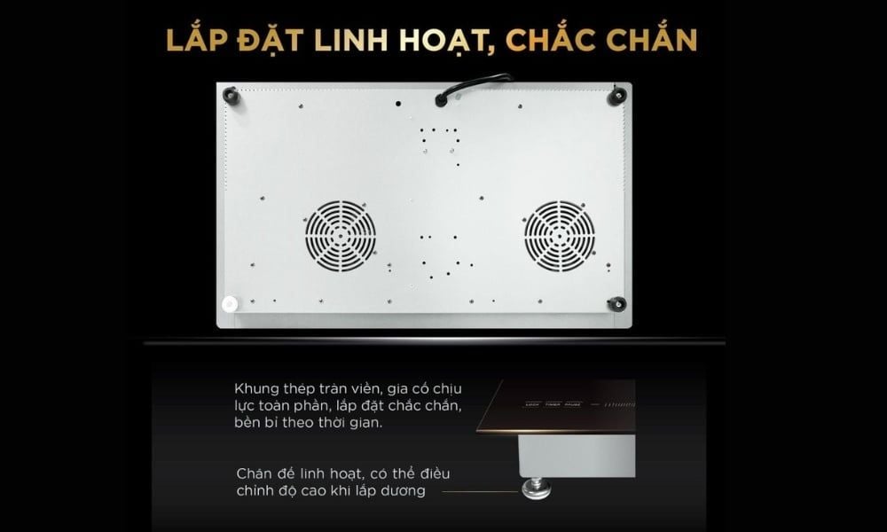 Phần khung thép mặt dưới tràn viền được gia công chắc chắn, giúp bếp vận hành ổn định, hạn chế rung lắc và tăng khả năng chịu lực khi sử dụng lâu dài. Đây là chi tiết ít khi được chú ý, nhưng lại đóng vai trò quan trọng trong việc bảo vệ linh kiện bên trong, đặc biệt với điều kiện khí hậu nóng ẩm tại Việt Nam.