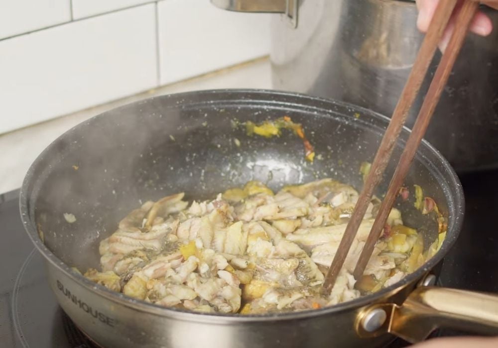 - Phần 1 (Xào mềm): Ướp với chút nước mắm, hạt nêm, gừng băm, nghệ giã nát. Phi thơm hành, cho cá vào xào săn nhẹ.