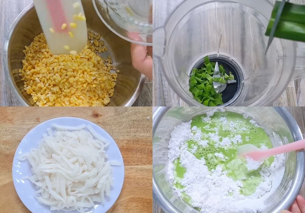 - Lá dứa rửa sạch, cắt khúc, xay nhuyễn với nước rồi lọc lấy nước cốt màu xanh.