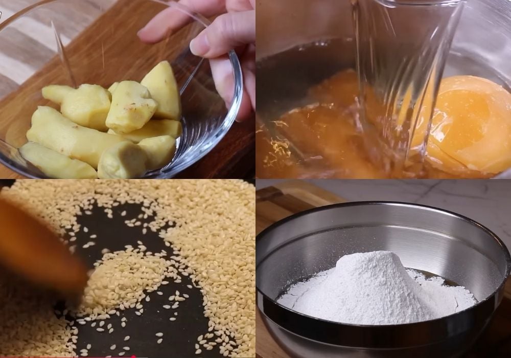- Rắc vừng (mè) rang chín lên bề mặt bánh ngay khi vừa tắt bếp để vừng bám chặt vào bánh.