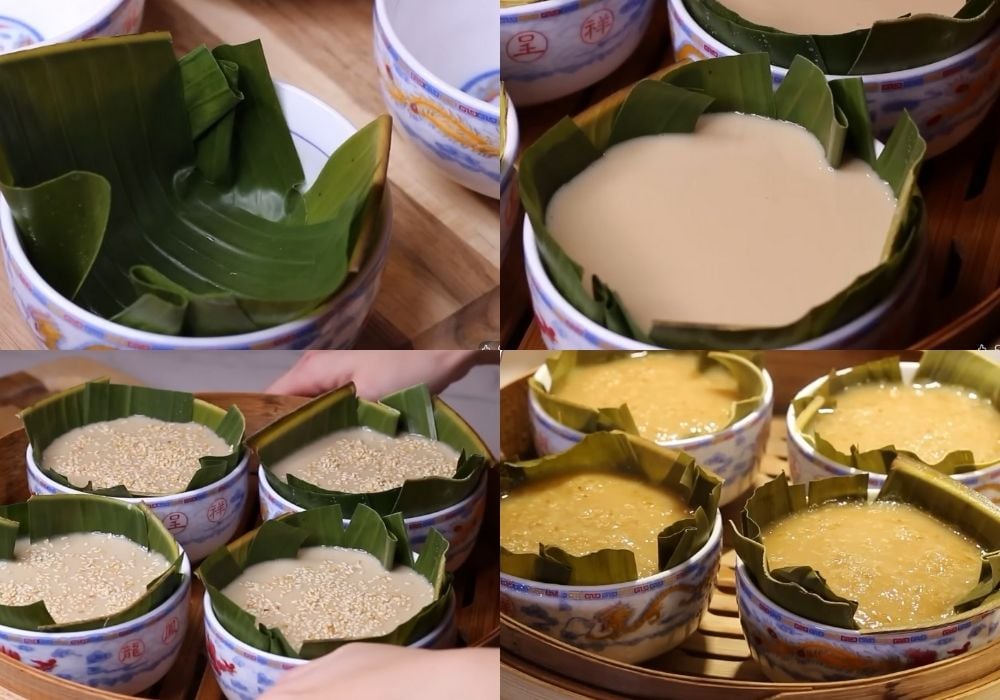 - Cắt lá chuối thành miếng tròn to. Xếp 2-3 lớp lá chồng lên nhau vào trong lòng bát tô (hoặc khuôn rọ tre), vuốt cho lá bám sát thành khuôn. Dùng tăm tre ghim mép lá lại cho chắc chắn. Quét lớp dầu ăn mỏng vào lòng khuôn lá để chống dính.