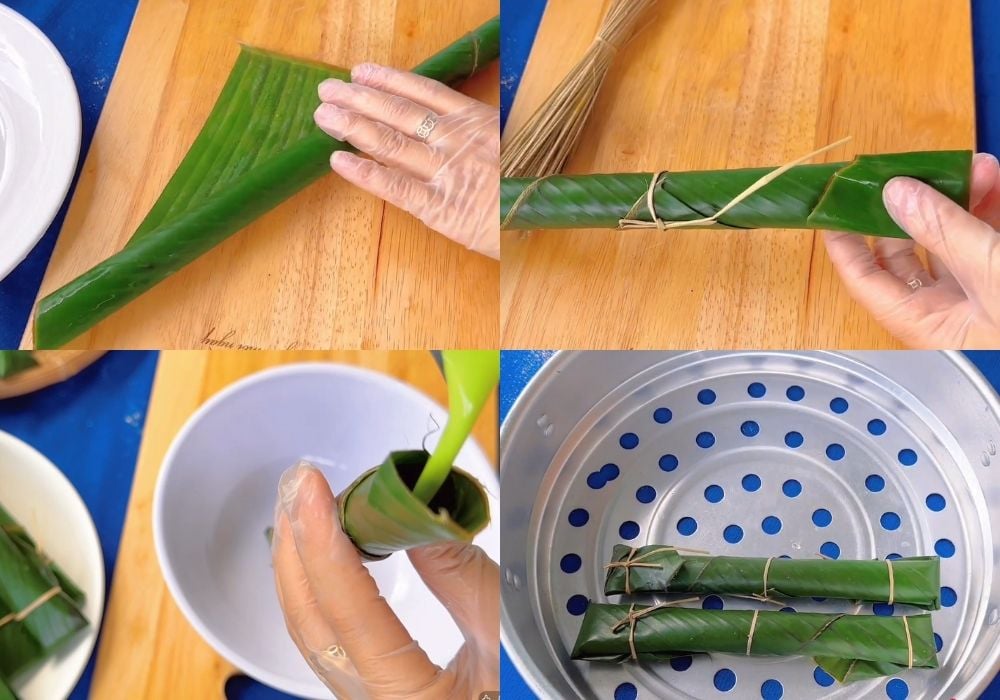 Mẹo hay: Nên cuốn lá chuối dày khoảng 2 3 lớp để khi luộc nước không ngấm vào trong làm nhạt bánh. Buộc dây ở đáy ống thật chặt tay, nếu lỏng bột sẽ rỉ ra ngoài khi hấp.