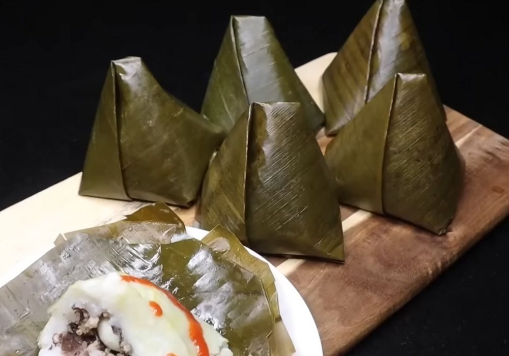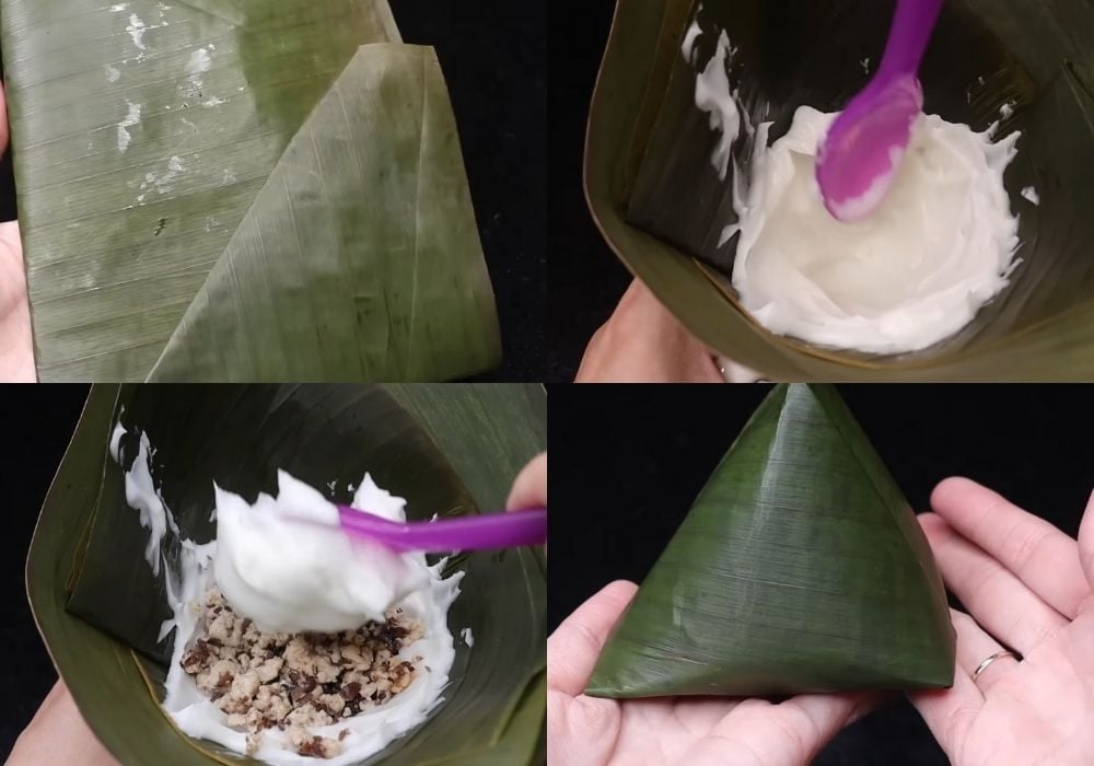 Gói bánh: Gấp hai mép lá đối diện lại với nhau, che kín mặt bột. Sau đó gấp tiếp hai mép còn lại, chỉnh sửa cho bánh có hình chóp tam giác cân đối (như kim tự tháp).