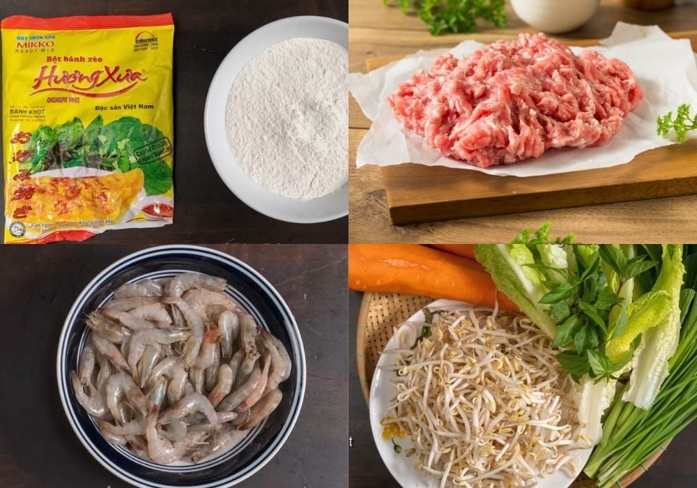 Nguyên liệu làm cách làm bánh xèo miền Bắc khá đơn giản, dễ tìm, tập trung vào sự tươi ngon của thực phẩm.
