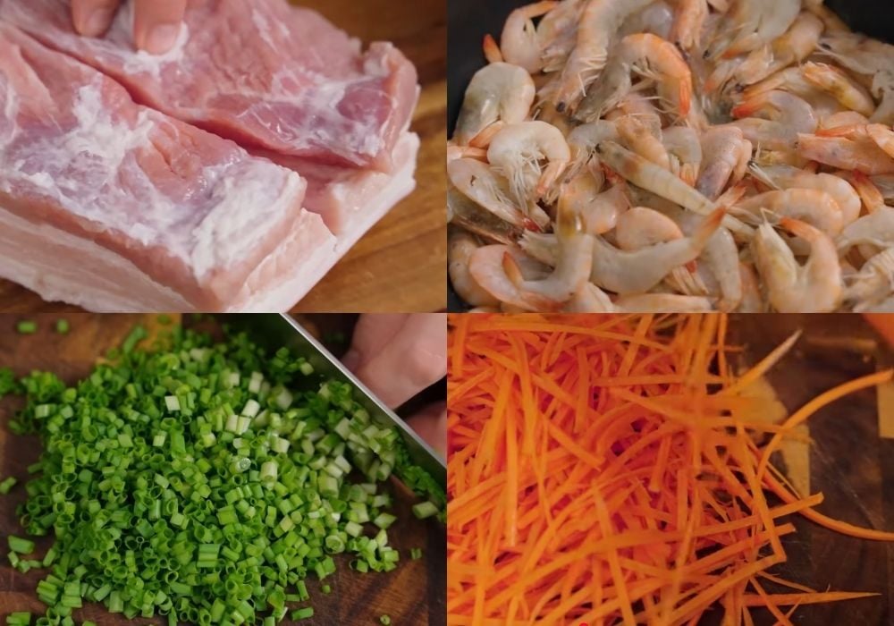 - Thịt ba chỉ: Rửa sạch, thái lát thật mỏng. Ướp thịt với chút hạt nêm, tiêu xay và hành tím băm.