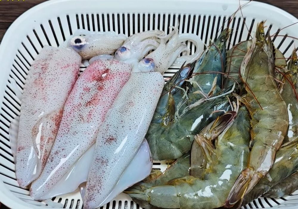 - Ướp chung tôm và mực với 1/2 muỗng cà phê hạt nêm, chút tiêu xay và đầu hành tím băm.