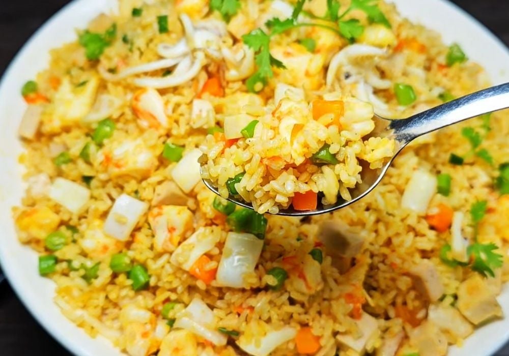 Cơm chiên hải sản là món ăn "quốc dân", được yêu thích từ quán ăn bình dân đến nhà hàng sang trọng. Sức hấp dẫn của món ăn đến từ sự kết hợp hoàn hảo giữa những hạt cơm tơi xốp, săn chắc, quyện trong trứng vàng ươm, cùng vị ngọt tươi của tôm, mực và độ giòn sần sật của rau củ. Đây là giải pháp tuyệt vời để xử lý phần cơm nguội còn lại, biến thành bữa ăn nhanh gọn, đủ chất và vô cùng bắt mắt.