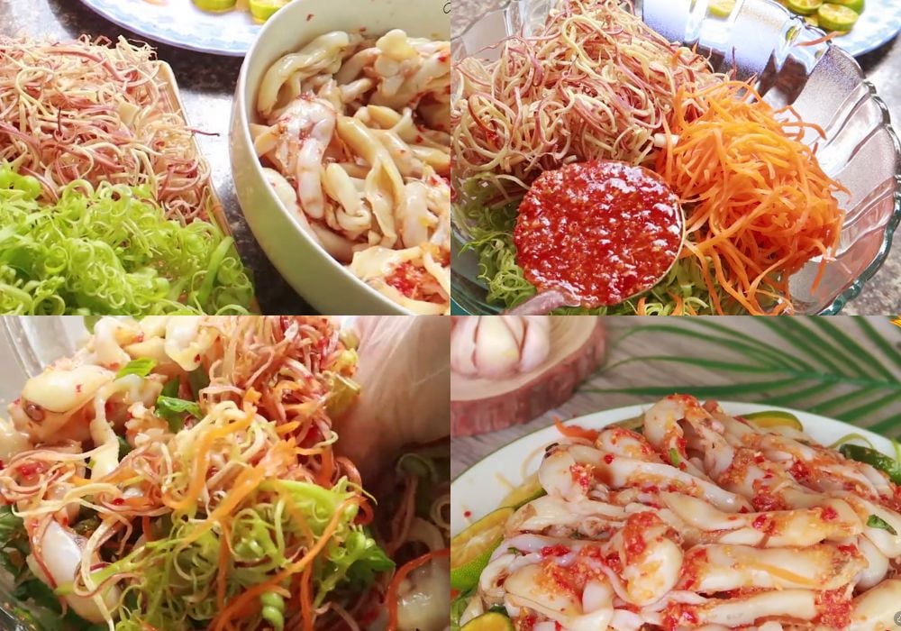 Món gỏi này ngon nhất khi được xúc bằng miếng bánh phồng tôm giòn tan. Vị béo của bánh phồng tôm cân bằng hoàn hảo với vị chua cay của gỏi. Đây chắc chắn là món khai vị "ghi điểm" tuyệt đối trong mọi bữa tiệc.