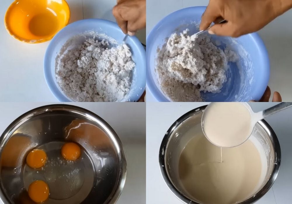 - Trộn bột hoàn chỉnh: Tạo hố trũng giữa âu bột khô. Đổ từ từ hỗn hợp lỏng vào. Dùng phới lồng khuấy nhẹ nhàng từ trong ra ngoài theo một chiều.