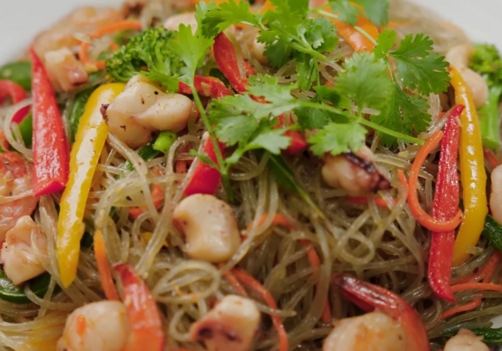 Miến xào hải sản là món ăn quen thuộc, thường xuất hiện trong các bữa cơm gia đình hoặc tiệc nhỏ, hấp dẫn bởi sự kết hợp giữa sợi miến dai mềm, vị ngọt tươi của hải sản và màu sắc bắt mắt của rau củ. Đây là món ăn cung cấp đủ tinh bột, đạm và chất xơ, mang lại bữa ăn cân bằng dinh dưỡng mà không hề gây ngán.