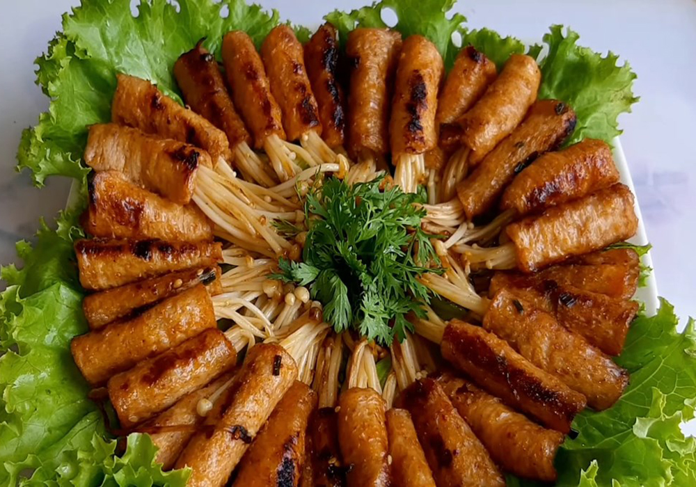 Thịt cuộn nấm kim châm chay là sự sáng tạo thú vị trong ẩm thực chay, thường sử dụng “thịt” thực vật làm từ đậu nành, lúa mì hoặc tàu hũ ky để cuốn nấm kim châm tươi. Khi hấp hoặc chiên nhẹ, lớp vỏ chay bên ngoài dai mềm bao lấy sợi nấm kim châm giòn ngọt, tạo nên món ăn vừa lạ miệng vừa đầy đủ dưỡng chất. Thịt cuộn nấm kim châm chay không chỉ ngon mà còn giàu protein thực vật, phù hợp cho người ăn kiêng, tập luyện thể thao hoặc muốn bổ sung thực phẩm xanh vào bữa ăn.