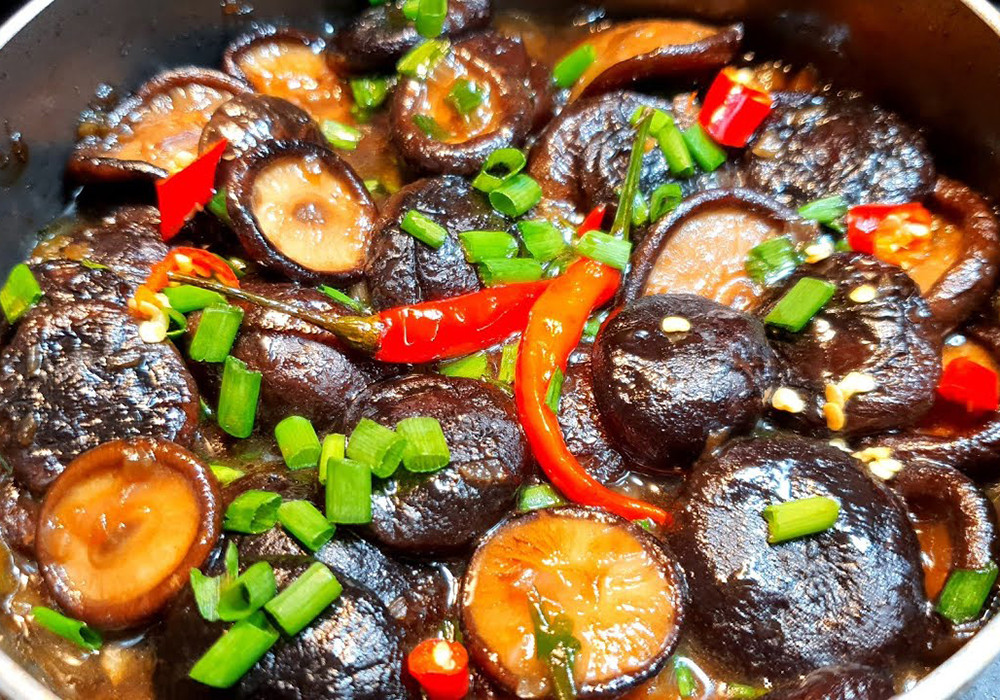 Nấm đông cô kho là món ăn truyền thống không thể thiếu trong các bữa cơm chay nhờ hương thơm tự nhiên, vị ngọt sâu và độ dai đặc trưng. Nấm đông cô sau khi ngâm mềm sẽ được kho cùng gia vị đậm đà, chút nước tương, đường phèn và tiêu sọ, đôi khi kết hợp thêm đậu hũ hoặc cà rốt cắt nhỏ để món ăn thêm phần hấp dẫn. Thành phẩm là những miếng nấm thấm vị, mềm nhưng vẫn giữ độ dai tự nhiên, mang lại cảm giác thanh nhẹ mà không hề đơn điệu. Nấm đông cô kho thích hợp ăn kèm cơm trắng hoặc làm món mặn trong mâm cỗ chay.