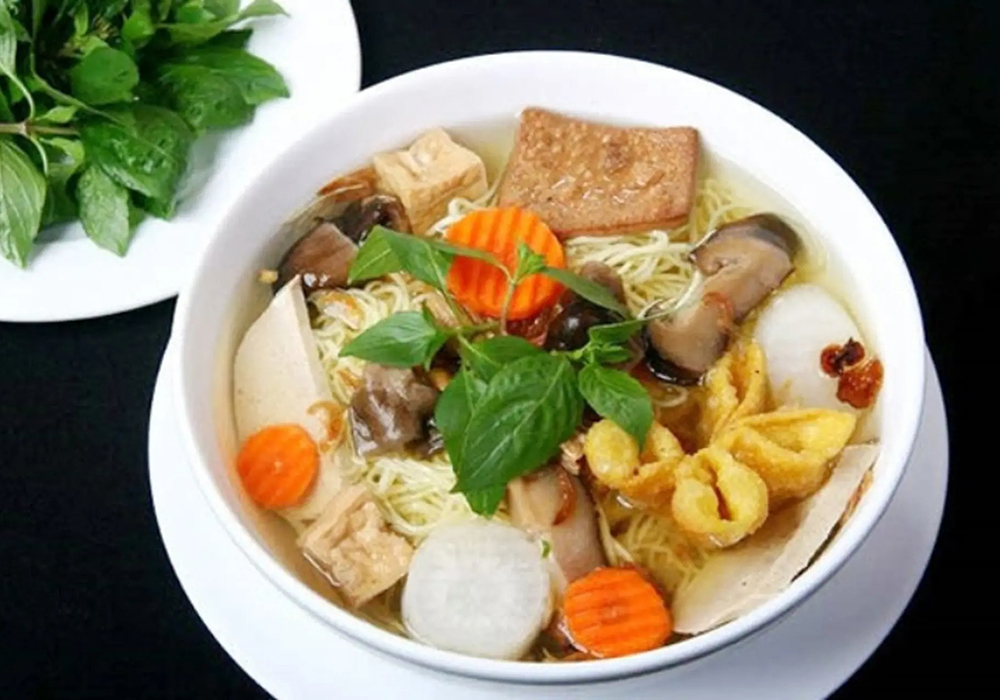 Hủ tiếu Thái chay là biến tấu hấp dẫn của món ăn nổi tiếng, mang đậm nét châu Á nhưng lại phù hợp cho người ăn chay. Nước dùng được nấu từ các loại nấm như nấm rơm, nấm đùi gà, nấm hương cùng rau củ để tạo vị ngọt tự nhiên. Sợi hủ tiếu dai mềm quyện cùng nước dùng thơm cay, kèm rau củ và đậu hũ non tạo nên món ăn đậm đà, bắt vị mà không hề ngán. Hủ tiếu Thái chay đặc biệt phù hợp cho bữa sáng hoặc những ngày thời tiết mát, vừa ấm bụng vừa cung cấp đầy đủ dưỡng chất.