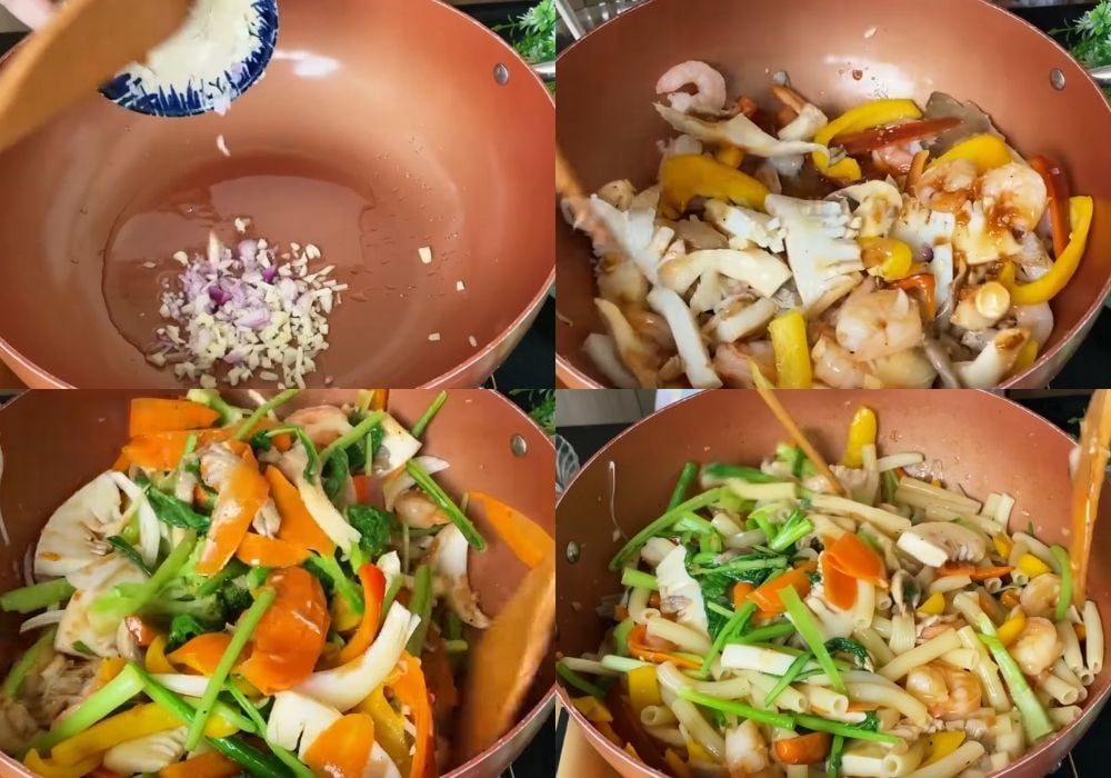 Quá trình xào đòi hỏi lửa lớn và thao tác nhanh tay để giữ độ giòn của rau củ và độ tươi của hải sản.
