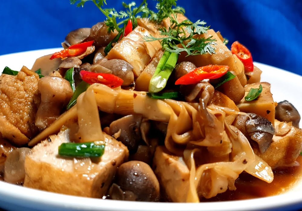 Tàu hũ ky kho nấm kết hợp cùng các loại nấm như nấm đông cô, nấm đùi gà, nấm rơm tạo nên món kho giàu dưỡng chất, đậm đà hương vị. Nấm bổ sung độ mềm và vị ngọt tự nhiên, tàu hũ ky lại dai nhẹ, thấm đều nước kho, tạo cảm giác tròn vị mà không cần dùng nhiều dầu mỡ. Đây là món chay phổ biến, thích hợp cho mọi lứa tuổi, dễ kết hợp với các món khác trong bữa cơm chay gia đình.