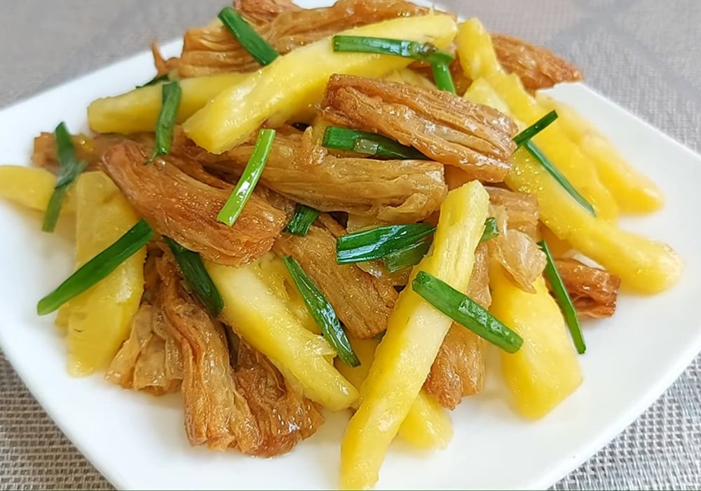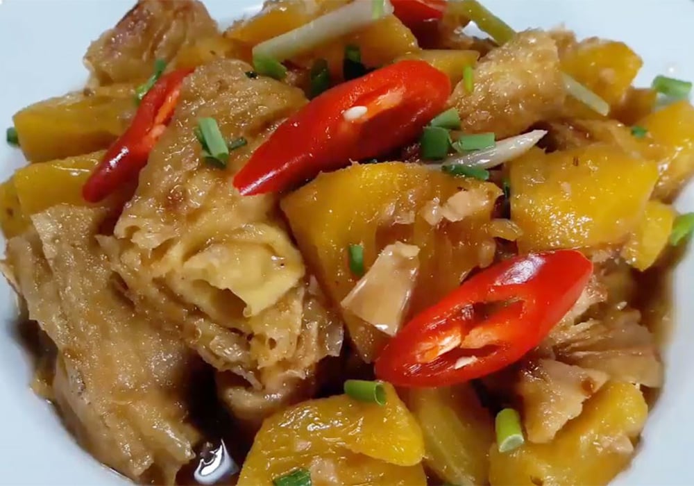 Tàu hũ ky kho măng nổi bật với sự kết hợp giữa vị dai nhẹ của tàu hũ ky và vị giòn ngọt của măng tươi. Măng được sơ chế sạch, thái sợi nhỏ, kho cùng tàu hũ ky và gia vị như nước tương, tiêu, hành… giúp món ăn thấm vị, hấp dẫn. Tàu hũ ky kho măng vừa dễ ăn vừa thơm ngon, thích hợp để đổi món hoặc bổ sung vào thực đơn hàng tuần, đảm bảo không bị ngán nhờ vị giòn mát của măng xen lẫn tàu hũ ky thấm gia vị.