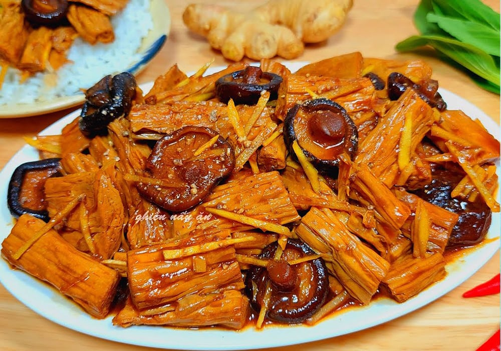 Tàu hũ ky xào nấm là sự kết hợp hoàn hảo giữa độ dai nhẹ của tàu hũ ky và vị ngọt tự nhiên của nhiều loại nấm như nấm đông cô, nấm rơm, nấm bào ngư, nấm mối… Món này đặc biệt giàu dưỡng chất, dễ ăn, phù hợp với những người ăn chay trường hoặc muốn tăng cường thực phẩm có nguồn gốc thực vật. Khi chế biến, tàu hũ ky cắt vừa ăn, xào nhanh tay cùng nấm và gia vị tạo nên món xào mềm ẩm, không bị khô. Món này ăn nóng rất ngon, có thể làm món chính hoặc dùng kèm bánh mì, cơm trắng đều phù hợp.