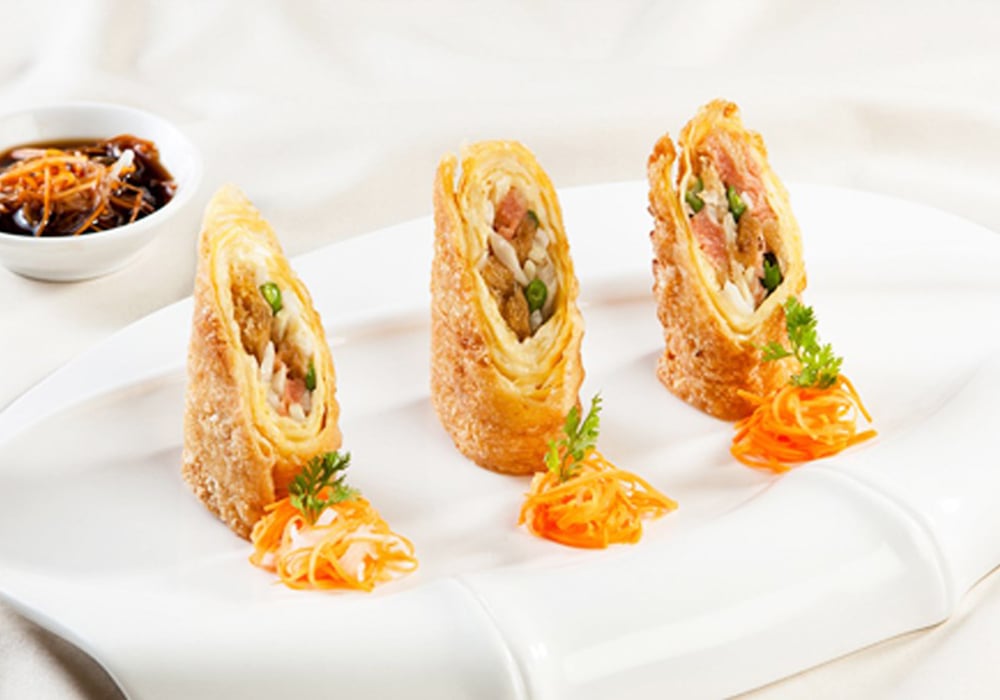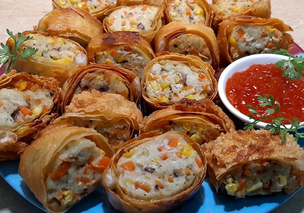 Tàu hũ ky cuộn rau củ chiên là món ăn khoái khẩu cho những ai yêu thích sự giòn rụm và màu sắc hấp dẫn của các loại rau củ hòa quyện cùng lớp vỏ tàu hũ ky. Nhân gồm nhiều loại rau củ như cà rốt, đậu que, bắp non, củ sắn, đôi khi còn kết hợp thêm nấm mèo hoặc miến chay để tăng vị đậm đà. Sau khi cuộn chắc tay, từng miếng được lăn qua bột và chiên ngập dầu, tạo nên lớp ngoài vàng óng, thơm lừng. Món này dùng nóng với tương ớt, sốt mayonnaise chay hay nước tương đều rất hấp dẫn, đặc biệt thích hợp trong các bữa tiệc gia đình hoặc dùng làm món ăn nhẹ.