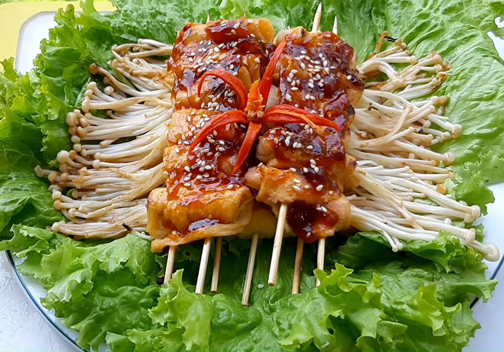Đây là món ăn thường xuyên xuất hiện trong các bữa tiệc chay hoặc cỗ cúng bởi sự kết hợp hoàn hảo giữa tàu hũ ky và nấm đùi gà – loại nấm nổi bật với độ giòn dai và vị ngọt thanh. Nấm được xé nhỏ, tẩm ướp gia vị vừa miệng, cuộn trong tàu hũ ky rồi hấp hoặc nướng nhẹ giúp nhân bên trong giữ trọn hương vị, còn lớp ngoài vẫn mềm mà không bị khô. Thành phẩm đem lại trải nghiệm như đang thưởng thức “thịt gà chay” nhưng lại hoàn toàn thanh đạm, tốt cho sức khỏe. Món này rất thích hợp dùng kèm nước chấm tương gừng hoặc nước mắm chay pha chua ngọt.