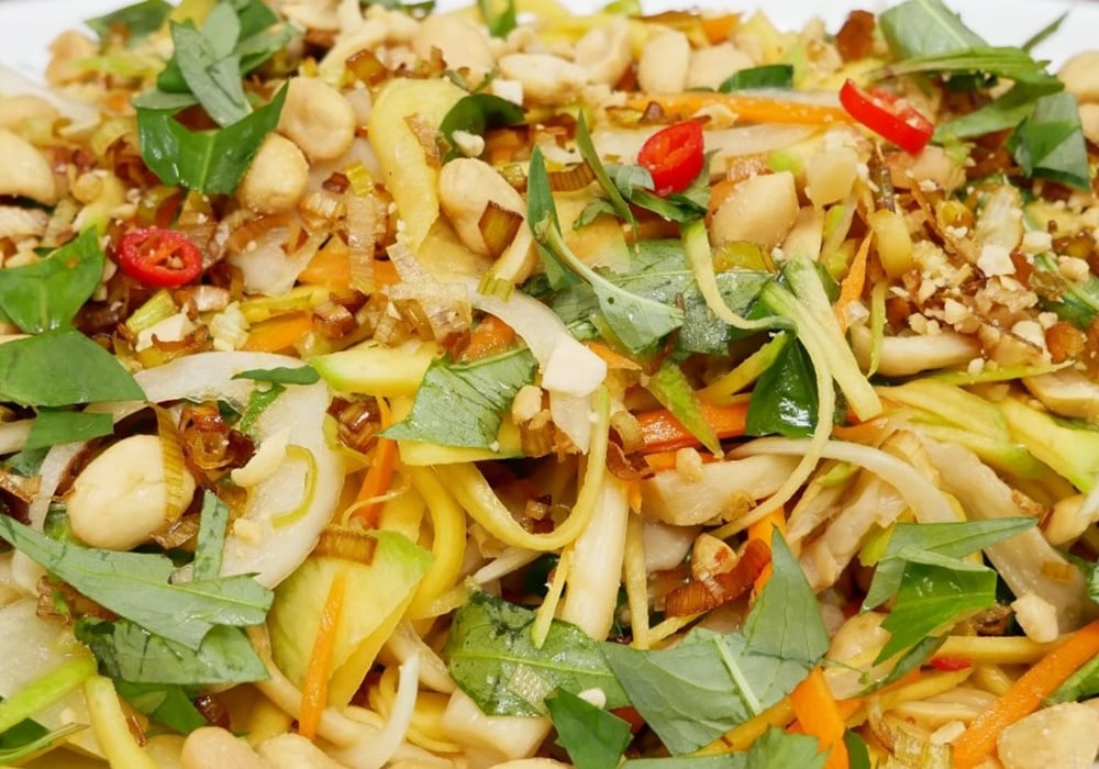 Gỏi mít non chay là sự kết hợp hài hòa giữa sợi mít non xé nhỏ dai mềm, đậm vị ngọt tự nhiên, hòa quyện cùng rau răm, đậu phộng, hành phi và nước trộn cay nhẹ. Để tăng độ hấp dẫn, nhiều người còn thêm nấm xào, tàu hũ chiên giòn hoặc đậu hũ non cắt sợi. Gỏi mít non chay không chỉ ngon miệng, lạ vị mà còn giúp bổ sung chất xơ, phù hợp cho những ai muốn tìm món ăn thanh đạm, giải ngán mà vẫn đảm bảo dinh dưỡng. Đây cũng là món gỏi thường xuyên xuất hiện trong thực đơn chay miền Trung.