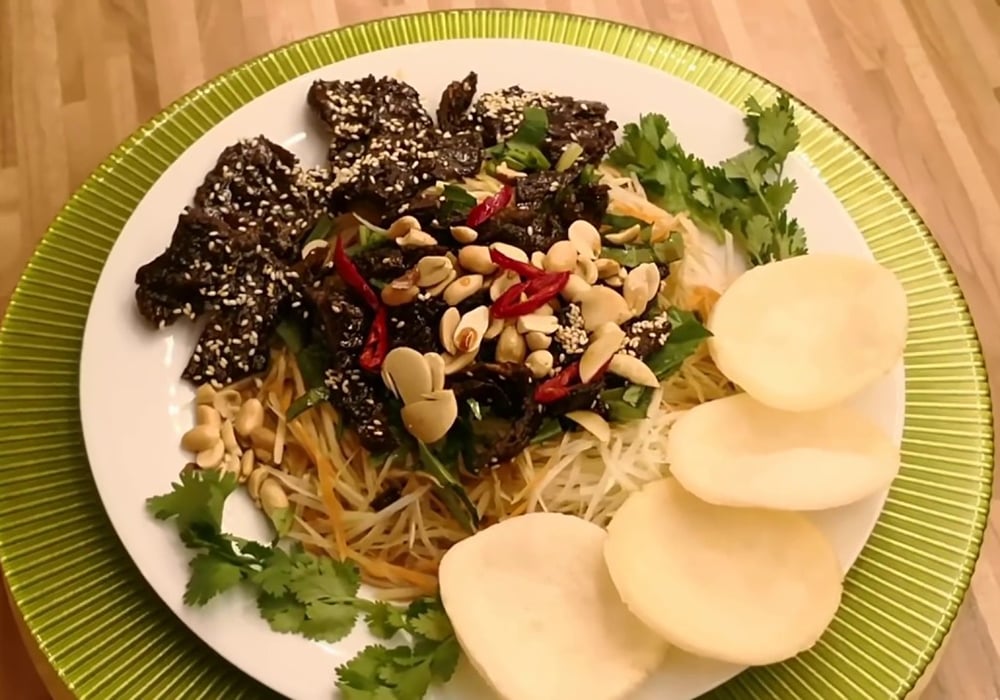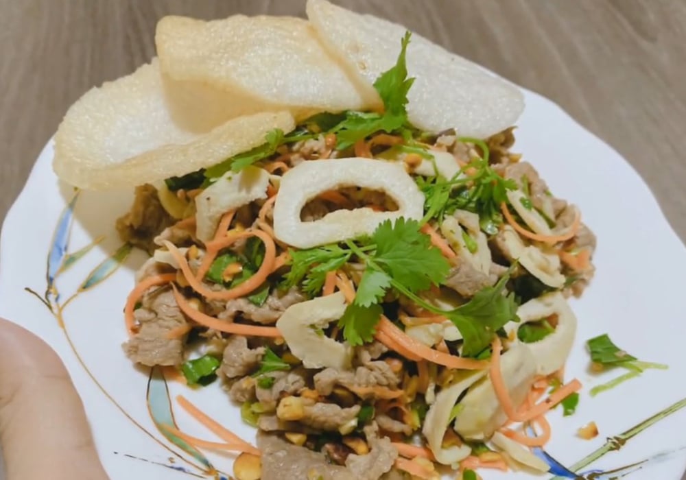 Gỏi khô bò chay là biến tấu thú vị từ gỏi khô bò truyền thống, sử dụng sợi khô bò chay làm từ nấm, mì căn hoặc đậu nành tẩm vị, kết hợp với đu đủ bào sợi, rau răm, đậu phộng rang, bánh phồng tôm chay và nước trộn chua ngọt. Vị dai đậm đà của khô bò chay, vị giòn tươi của đu đủ, chút cay của ớt tạo nên món gỏi hấp dẫn, phù hợp cho bữa ăn nhẹ, món khai vị hoặc ăn vặt đổi vị cho ngày cuối tuần.