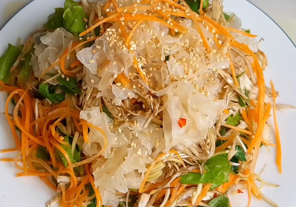 Gỏi nấm tuyết chay nổi bật với độ giòn mát, thanh khiết của nấm tuyết kết hợp cùng dưa leo, cà rốt, ớt chuông, đậu phộng, rau thơm và nước trộn chua ngọt dịu nhẹ. Khi ăn, vị giòn sần sật của nấm tuyết hòa quyện cùng các thành phần rau củ, mang lại cảm giác mát lành, nhẹ bụng và vô cùng lạ miệng. Món này phù hợp cho bữa tiệc, khai vị, ăn vặt hoặc các bữa ăn eat clean nhờ giàu chất xơ, vitamin và hoàn toàn không béo.