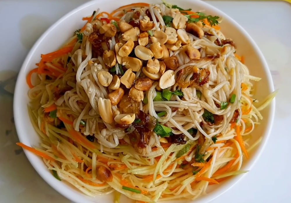Gỏi đu đủ chay nổi bật nhờ sợi đu đủ xanh giòn sần sật, thấm đẫm nước trộn chua cay mặn ngọt tinh tế, hòa quyện cùng cà rốt, đậu phộng, rau răm và các loại topping chay như nấm xé sợi hoặc bánh phồng chay. Khi ăn, vị giòn tươi và ngọt mát của đu đủ tạo cảm giác thanh nhẹ, giải nhiệt, đồng thời kích thích vị giác, giúp bữa ăn trở nên cân bằng hơn. Đây là món gỏi quen thuộc trong các bữa tiệc chay miền Nam và cũng rất được ưa chuộng cho thực đơn eat clean, giảm cân nhờ ít chất béo và giàu xơ.