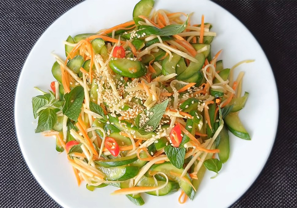 Gỏi dưa leo chay là lựa chọn tuyệt vời cho ngày hè nhờ hương vị thanh mát và độ giòn sần sật của dưa leo tươi. Dưa leo được cắt lát mỏng hoặc bào sợi, kết hợp cùng cà rốt, hành tây tím, rau húng và đậu phộng rang, rồi rưới nước trộn chua ngọt dịu nhẹ, thêm chút ớt cho dậy vị. Món gỏi này giúp thanh lọc cơ thể, cung cấp nước và vitamin, phù hợp làm món ăn kèm hoặc ăn nhẹ bất cứ lúc nào. Gỏi dưa leo chay còn dễ biến tấu thêm tàu hũ ky, nấm hoặc chả chay để tăng hương vị và dinh dưỡng.