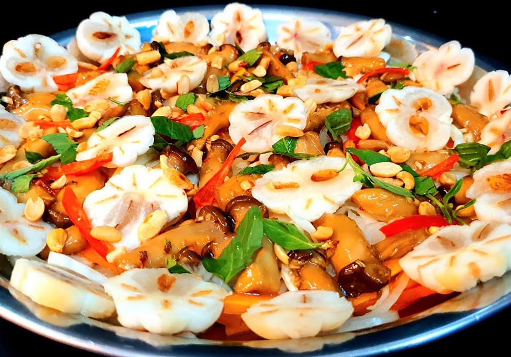 Gỏi ngó sen chay sở hữu vị giòn thanh tự nhiên của ngó sen non, điểm xuyết màu đỏ của cà rốt, vị béo nhẹ từ đậu phộng rang và chút cay nhẹ từ ớt. Khi trộn với nước mắm chay pha chua ngọt, món gỏi ngó sen giữ được độ tươi giòn và tạo cảm giác thanh mát đặc biệt. Thường được bổ sung thêm nấm bào ngư xé sợi hoặc chả chay thái mỏng, món gỏi này không chỉ đẹp mắt mà còn mang lại giá trị dinh dưỡng cao, hỗ trợ tiêu hóa, phù hợp cho cả bữa tiệc, cỗ chay lẫn bữa ăn thường ngày.