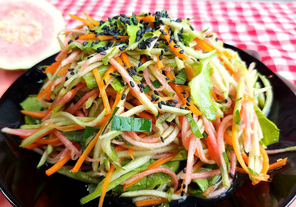 Gỏi ổi chay là món ăn nhẹ đầy sáng tạo, sử dụng ổi tươi giòn cắt lát, trộn cùng muối ớt, đường, nước tắc và rau thơm như bạc hà hoặc húng lủi. Để thêm phần hấp dẫn, người ta có thể bổ sung đậu phộng rang, hành phi hoặc topping chay như nấm chiên giòn. Vị chua ngọt, cay nhẹ, thơm nồng của ổi hòa quyện cùng các thành phần khác tạo nên món gỏi dễ ăn, tốt cho tiêu hóa, làm mới thực đơn ngày hè và giúp bữa ăn thêm phần thú vị.