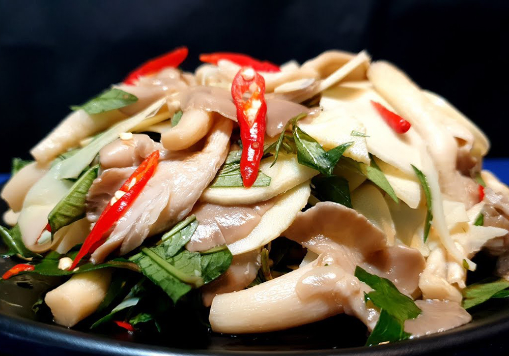 Gỏi tàu hũ ky nấm đùi gà là sự kết hợp hoàn hảo giữa độ giòn dai của tàu hũ ky chiên, vị ngọt thanh của nấm đùi gà xé sợi, rau răm, cà rốt, đậu phộng và nước trộn chua ngọt. Khi thưởng thức, từng miếng tàu hũ ky vàng ruộm, nấm đậm vị, quyện cùng rau củ tươi mát tạo cảm giác hài hòa, dinh dưỡng và rất dễ ăn. Món gỏi này phù hợp cho cả người lớn lẫn trẻ nhỏ, thích hợp dùng làm khai vị hoặc món ăn chính nhẹ nhàng cho ngày hè.