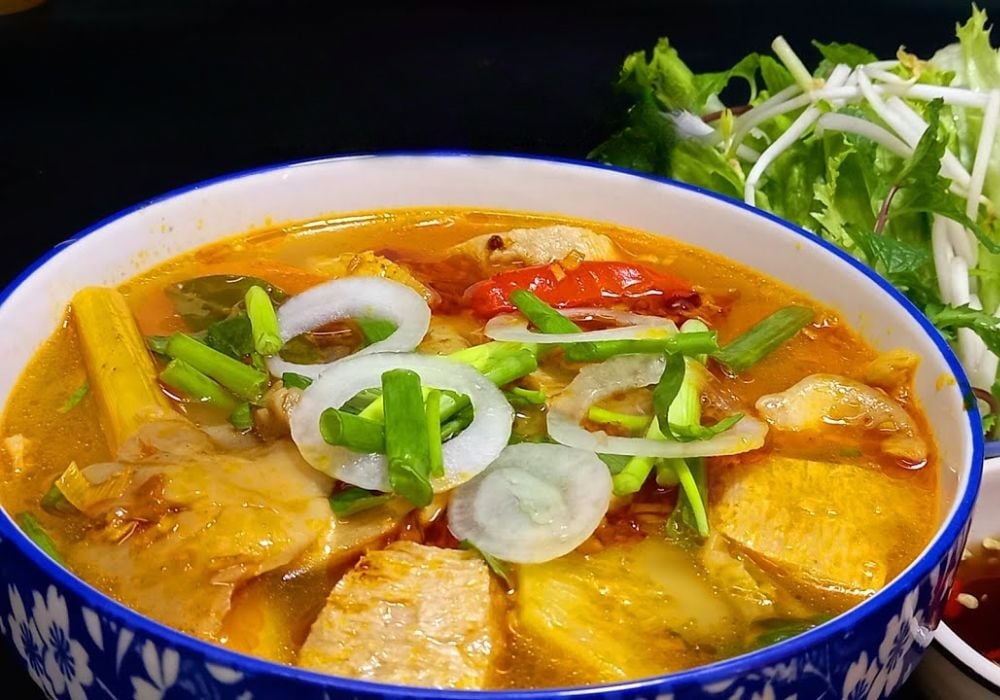 Nhắc đến ẩm thực Cố đô, bún bò Huế chay là phiên bản không thể bỏ lỡ. Nước dùng mang màu đỏ cam hấp dẫn, đậm đà hương sả và sa tế cay nồng đặc trưng, được cân bằng bởi vị ngọt thanh từ dứa và các loại rau củ. Tô bún đầy đặn với nấm mềm ngọt, đậu hũ chiên béo bùi, và chả chay dai dai, mang đến trải nghiệm ẩm thực vô cùng trọn vẹn.