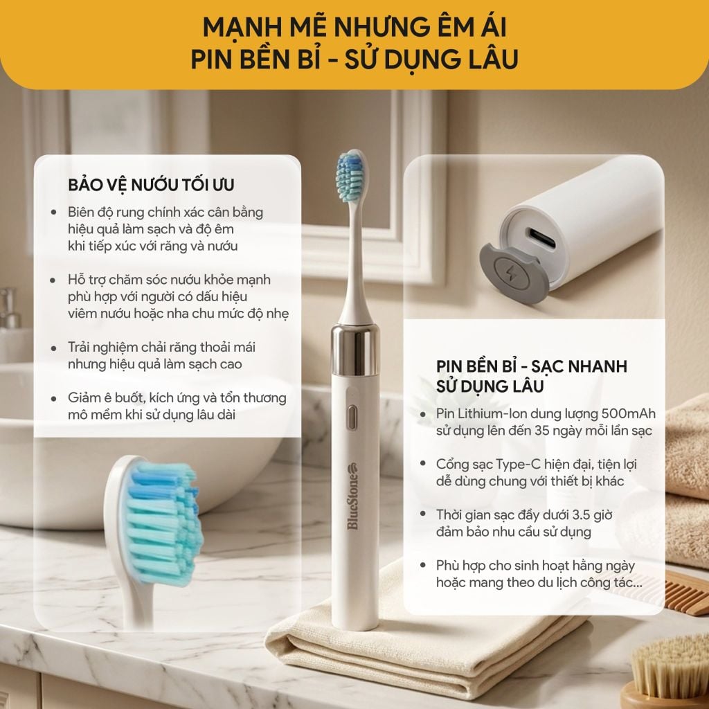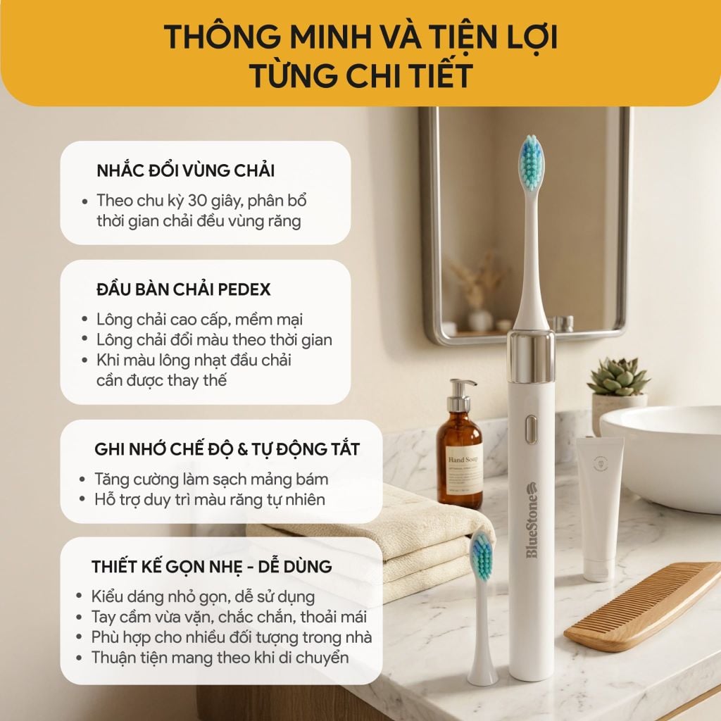 Bàn chải điện BlueStone OCB-1015W không chỉ là một thiết bị công nghệ, mà là "người bạn đồng hành" tận tâm cho sức khỏe răng miệng của cả gia đình. Đừng để những mảng bám cứng đầu hay thói quen đánh răng sai cách làm ảnh hưởng đến sự tự tin của bạn. Hãy để BlueStone chăm sóc nụ cười của bạn một cách chuyên nghiệp nhất mỗi ngày.