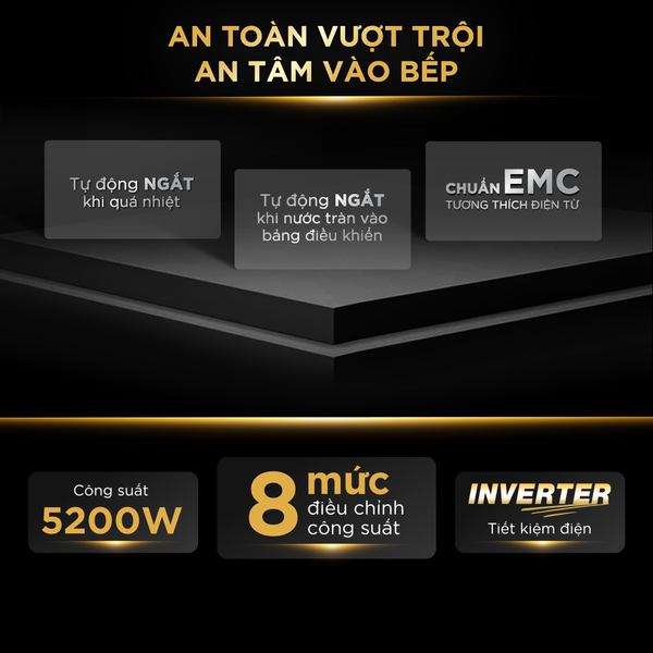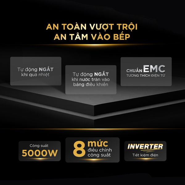 Bên cạnh đó, bếp được ứng dụng công nghệ Inverter tiên tiến, bếp vận hành ổn định, giữ nhiệt đều và giúp tiết kiệm điện năng đáng kể. Công nghệ này không chỉ tối ưu chi phí sử dụng điện hàng tháng mà còn góp phần bảo vệ môi trường, phù hợp với xu hướng sống xanh hiện đại.