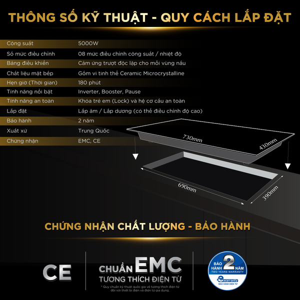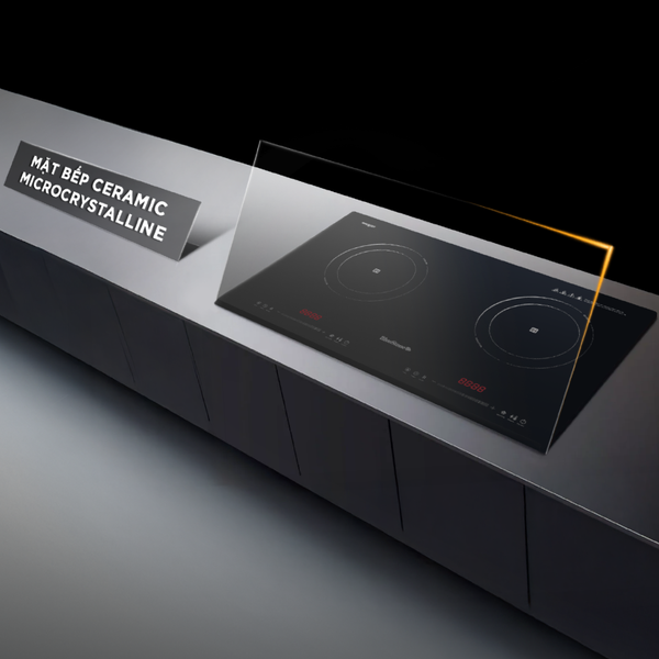 Sản phẩm sử dụng mặt kính Ceramic Microcrystalline cao cấp, nổi bật với khả năng chịu nhiệt, chịu lực cực tốt và chống trầy xước vượt trội. Bề mặt kính sáng bóng, dễ lau chùi, không chỉ đảm bảo tính an toàn trong quá trình sử dụng mà còn mang lại vẻ ngoài hiện đại, sang trọng cho không gian bếp.