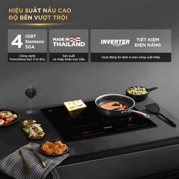Điểm khác biệt nổi bật của BlueStone ICB-6949 chính là được trang bị 4 IGBT Siemens 30A công nghệ TrenchStop™ Gen 5 (Đức). Linh kiện cao cấp này giúp bếp đạt hiệu suất tối ưu, vận hành bền bỉ và ổn định trong suốt quá trình nấu nướng. Đồng thời, công nghệ tiên tiến từ Đức còn giúp bảo vệ linh kiện bên trong, giảm thiểu hư hại, từ đó tăng tuổi thọ sản phẩm vượt trội so với nhiều dòng bếp thông thường.