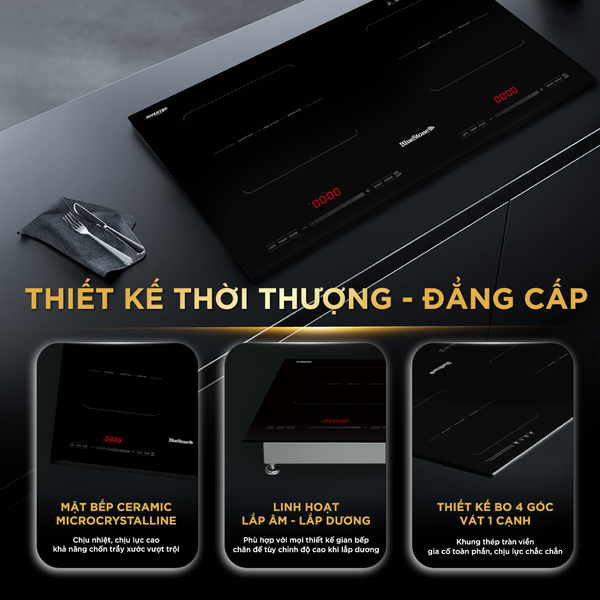 Với thiết kế tinh tế bo 4 góc, vát 1 cạnh cùng khung thép mặt dưới chắc chắn, tạo được tính ổn định, bền vững khi lắp đặt và sử dụng. Đặc biệt bếp được thiết kế hiện đại với 2 kiểu lắp đặt: lắp âm sang trọng hoặc lắp dương tiện dụng. Trong trường hợp lắp dương, chân đế của bếp có thể điều chỉnh độ cao linh hoạt, phù hợp với nhiều không gian bếp khác nhau. Thiết kế này mang đến sự linh hoạt tối đa, giúp sản phẩm trở thành lựa chọn lý tưởng cho cả căn bếp mới xây dựng lẫn bếp cần cải tạo.
