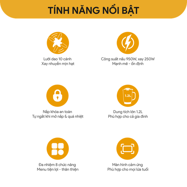 - 8 chức năng tích hợp sẵn: sữa đậu nành, cháo, sữa bắp, sữa hạt, sinh tố, đun nước, làm sạch, hẹn giờ.
